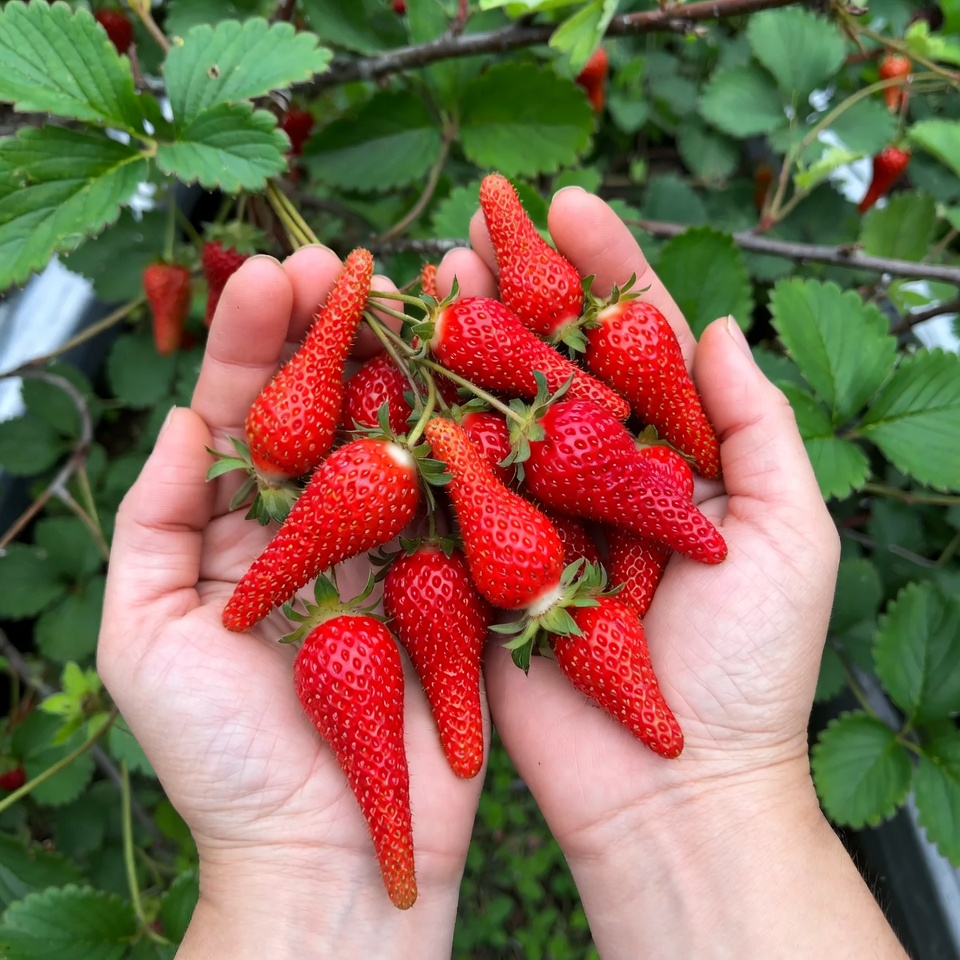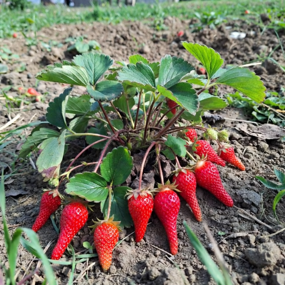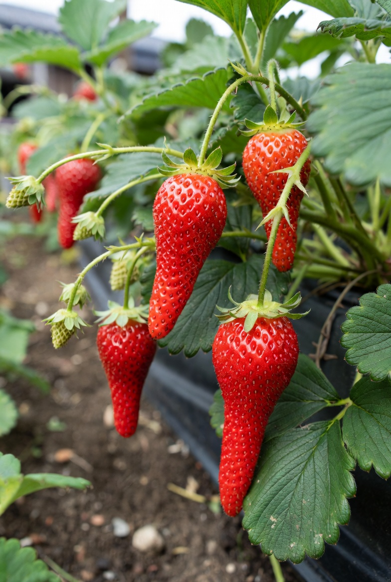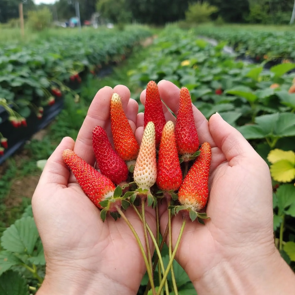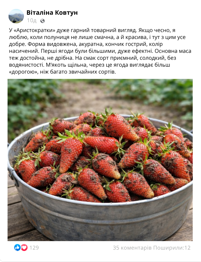 «Аристократка» — ранній великоплідний сорт полуниці з ефектною видовженою формою ягід, щільною м’якоттю та вираженим солодким смаком. Плоди великі, акуратні, подовжені, з красивим загостреним кінчиком. Середня вага ягоди становить близько 21–27 грамів, а перші плоди за гарного догляду можуть бути ще більшими. Саме така полуниця одразу привертає увагу на грядці й виглядає особливо привабливо після збору.