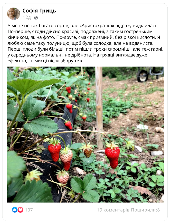 Полуниця «Аристократка» – сорт, який поєднує красу ягоди, рясний урожай і виражену солодкість!