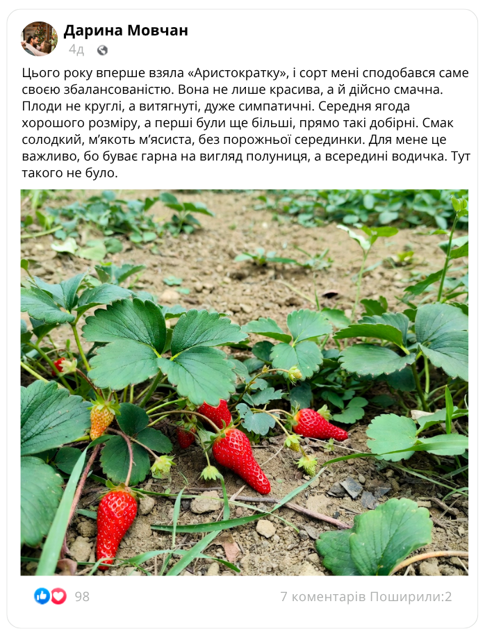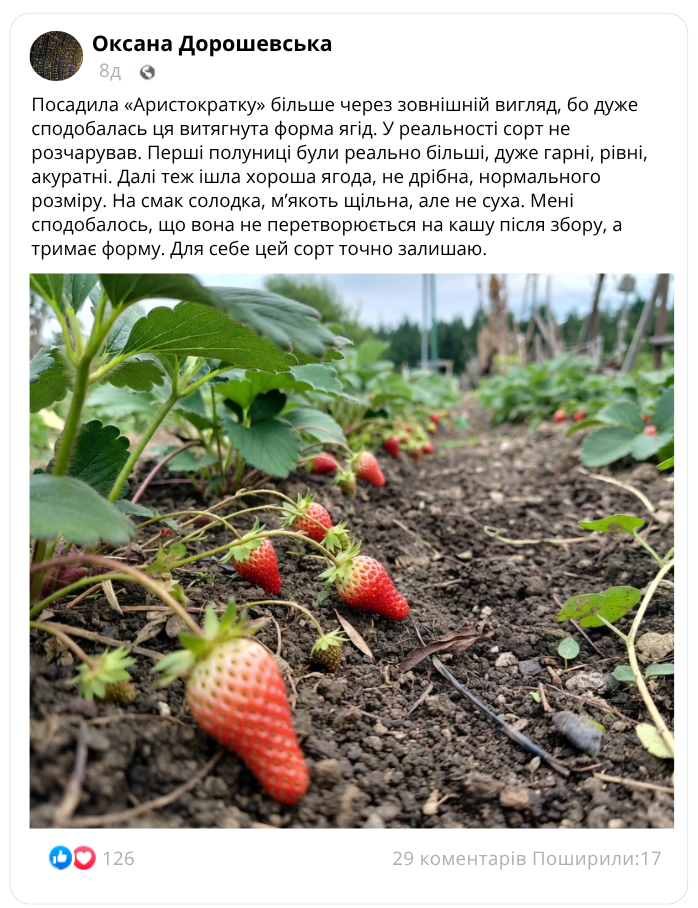 Важливо й те, що солодкість у «Аристократки» поєднується з щільною, соковитою м’якоттю. Завдяки цьому смак не здається водянистим або порожнім, а сама ягода залишає приємне враження вже з першого збору. Саме така структура плодів робить сорт особливо вдалим для свіжого споживання, домашніх десертів і для тих, хто шукає не просто гарну, а справді смачну полуницю.